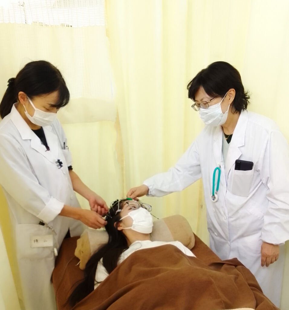 症例2.30代後半女性 シノブ様。不妊症と不育症。当院の不妊治療を開始し妊娠したが、不育症が原因で2か月目に流産。諦めずに当院治療を継続し妊娠。無事に元気な女児を出産された。その後、数年前に発症し治ることを諦めていた顔面神経麻痺の治療を始め現在完治に向けて通院中。写真:シノブ様鍼灸治療中