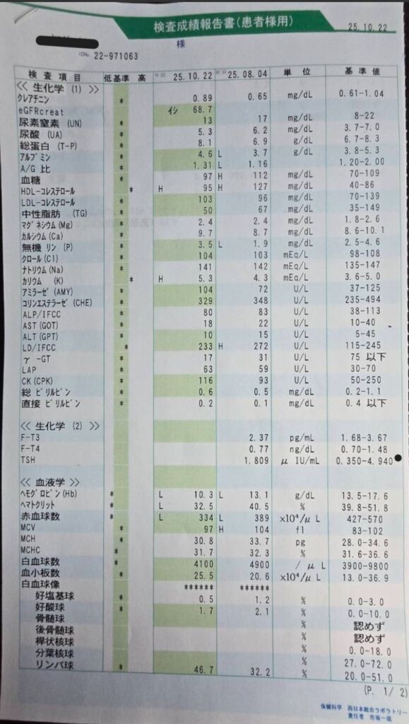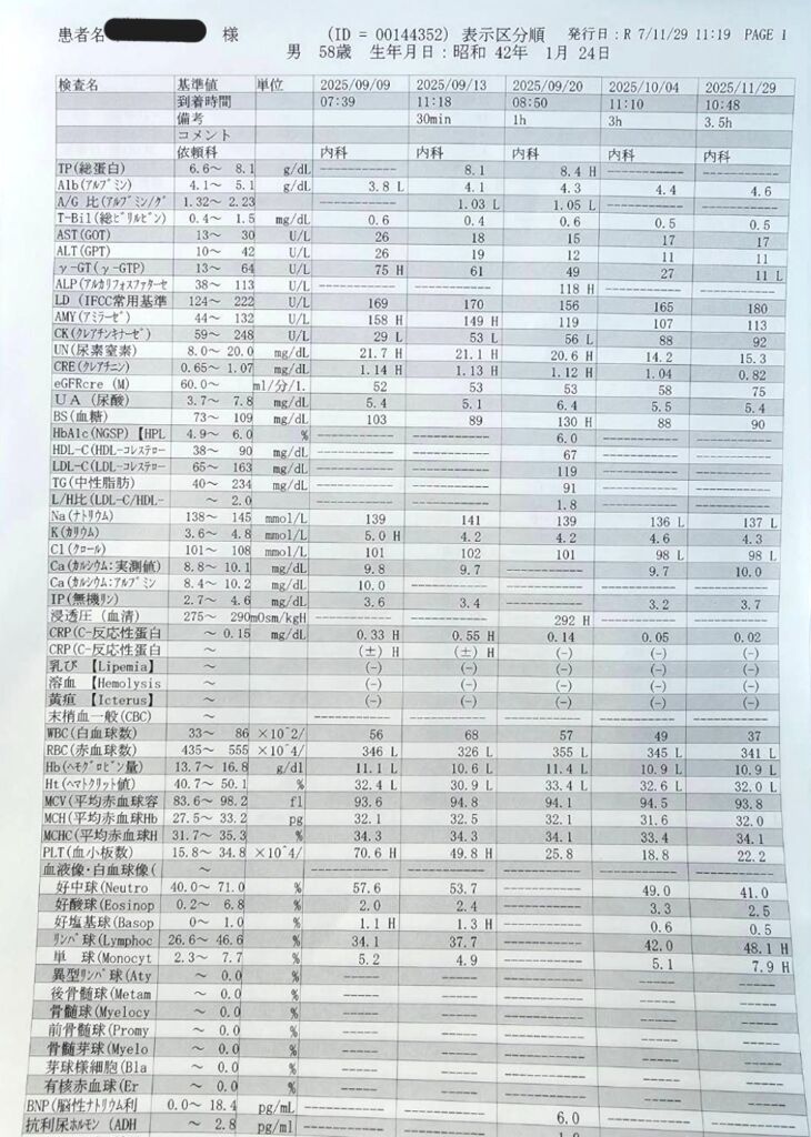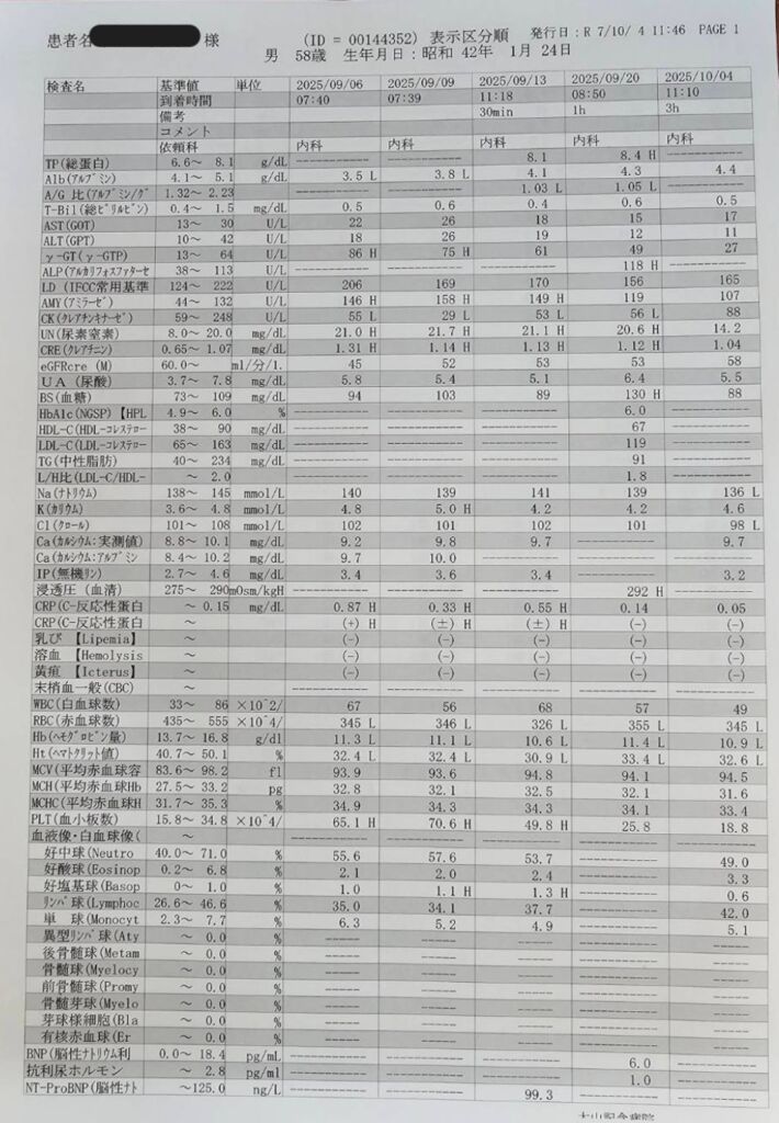 | 2024年6月27日 (治療前) | 2024/7/30 (治療後) | 2024年9月3日 | 2024年9月11日 | 基準値 | |